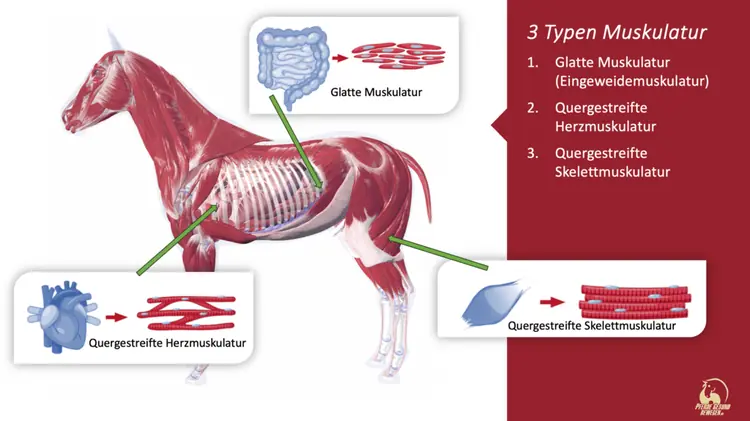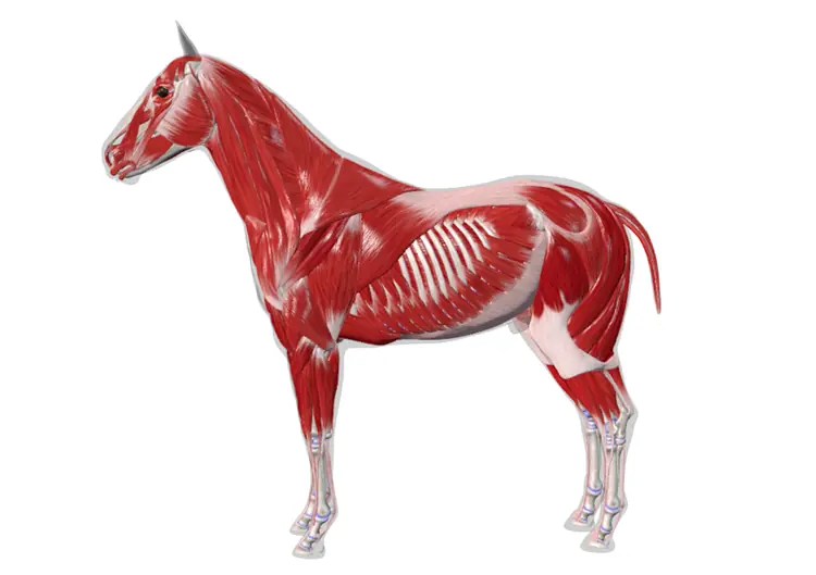 Der Pferdekörper besitzt ca. 260 Muskeln und machen bis zu 45% des Gesamtgewichts des Pferdes aus. Der Rumpf des Pferdes weist über 100 Muskeln auf. Am Kopf des Pferdes finden wir 40 weitere Muskeln. Die Vordergliedmaßen besitzen 46 Muskeln und die Hintergliedmaßen weitere 66 Muskeln.