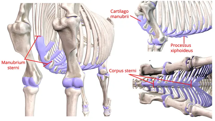 Das Brustbein oder auch Sternum ist der am weitesten ventral gelegene Anteil des Brustkorbs (Thorax). Das Sternum ist über die Rippenknorpel (Cartilago costalis) mit dem Rippenkörper (Corpus costalis) verbunden.