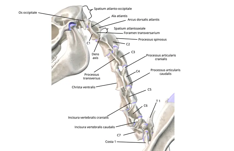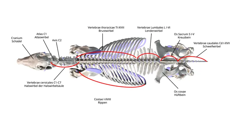 Die Halswirbelsäule des Pferdes verläuft S-förmig vom Hinterhaupt des Kopfes zur Brustwirbelsäule. Das Pferd hat genau wie andere Säugetiere 7 Halswirbel.